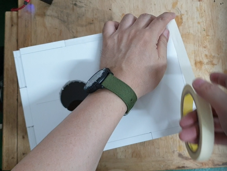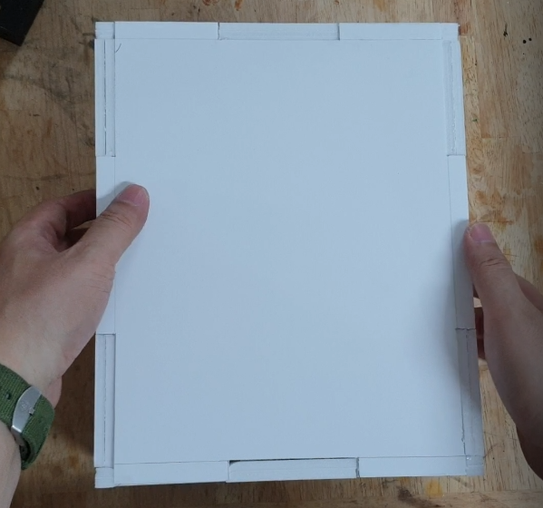 이 테이프 작업을 아무래도 무게 등의 힘을 받기 때문에 폼보드 만으로는 지지하는 힘이 약할 것으로 보입니다. 가능하다면 튼튼한 테이프 또는 조금 두꺼운 종이를 사용해서 보강해 조면 좋을 것 같습니다.