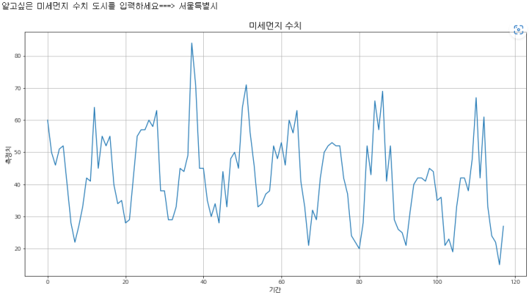 name = input('알고싶은 미세먼지 수치 도시를 입력하세요===> ') # 도시명 입력 받기