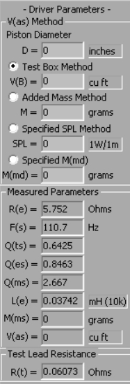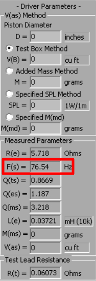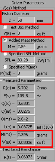 Piston Diameter를 58 mm로 입력하고, Added Mass Method는 2.54 grams로 입력합니다. 2.54 grams은 앞에서 Fs를 110Hz에서 76.54Hz로 약 31% 낮춘 무게입니다.