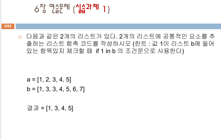 if a[i] in b: # in 은 리스트에 해당 요소가 있는지 확인. a[i] 증 a의 i번쩨 요소값이 b 리스트에 있는지 확인