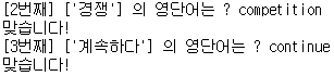 in_e = input(f'[{i}번째] {k} 의 영단어는 ? ') # 한글 단어를 보이기 영단어 입력 받기