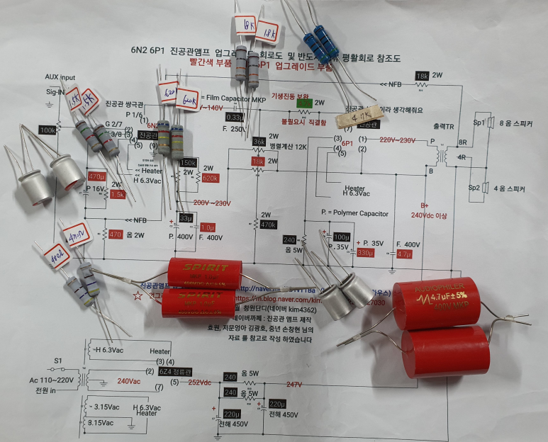 업그레이드 부품에 회로도입니다. 빨간 박스의 저항은 서비스로 보내 주셨는데, 제 6V6 앰프에서는 진동이 없어서 사용하지 않았습니다.