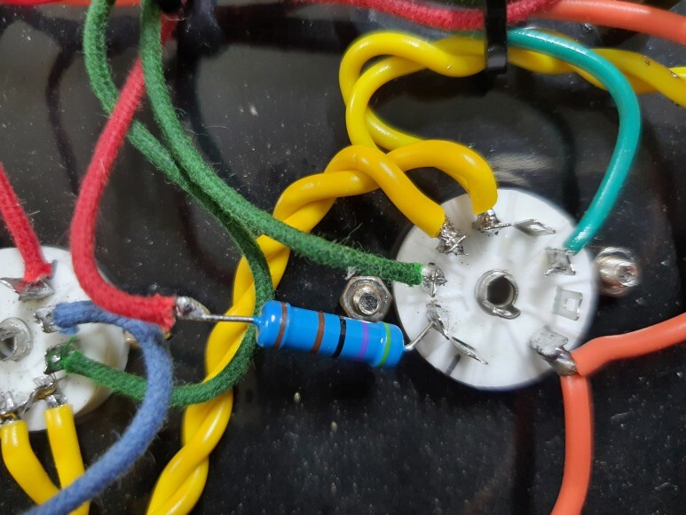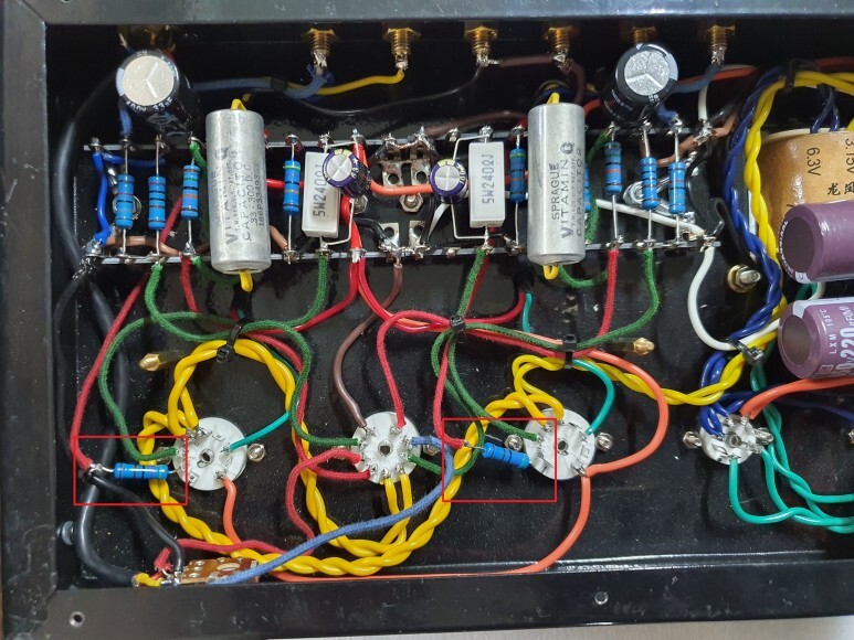 초단증폭(6N2)에서 커플링 콘덴서를 거쳐 출력관(6P1)으로 가는 라인에 4.7K 저항을 연결하는 것입니다.
