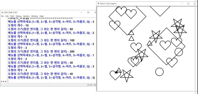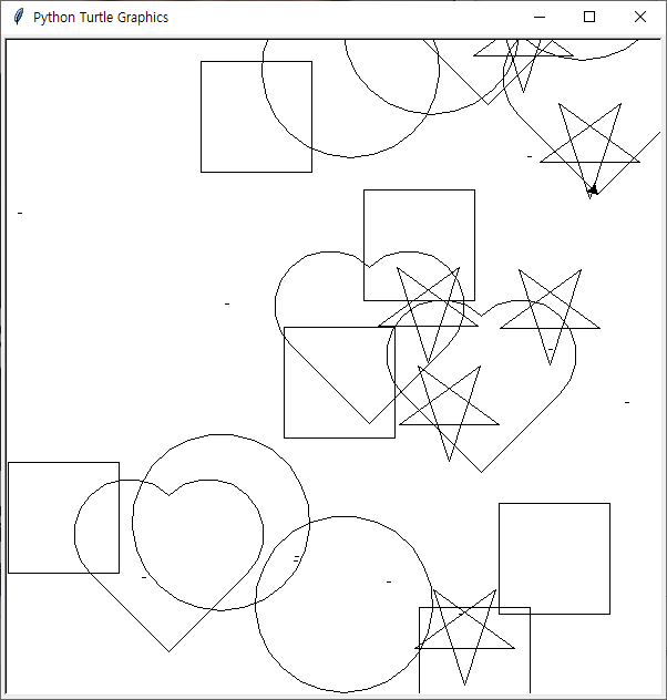func = [circle, line, square, star, heart] # 도형 종류에 따른 함수를 리스트로 만듬(인덱스가 도형명과 같음)