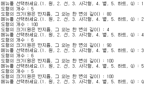 도형 선택 메뉴를 함수로 작성하고, 각 도형을 그리는 함수를 작성해요 (원, 선, 사각형, 별, 하트 등 5가지 이상) 그리고 도형의 크기와 개수는 입력받고 위치는 램덤으로 그리는 프로그램