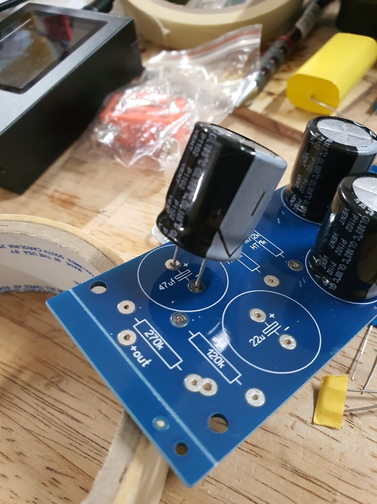 전원PCB보드 위치에 다른 부품이 겹치지 않도록 47uF콘덴서로 부품들 시작 위치를 잡아 줍니다.
