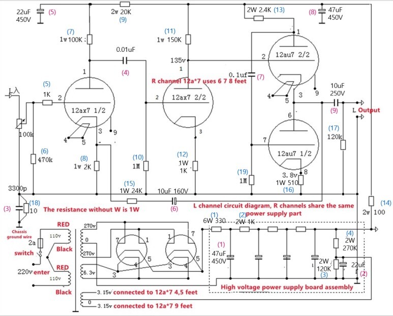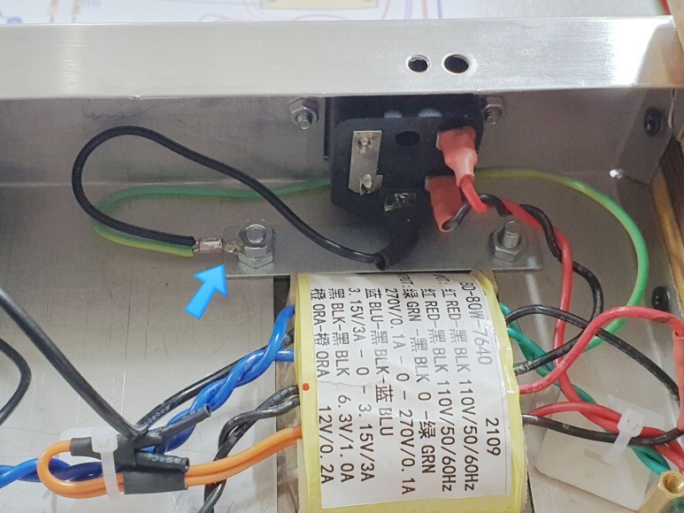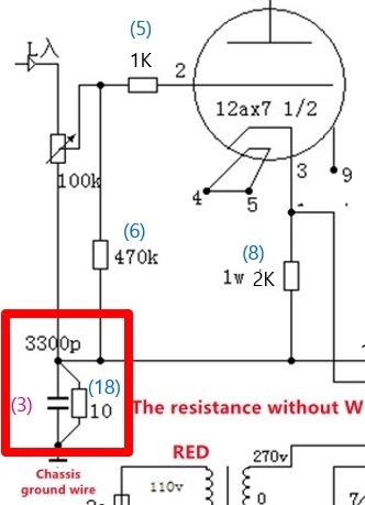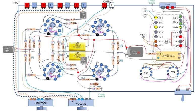 지금까지 만들던 진공관앰프 회로와 다른 것은 콘덴서 3번, 저항 18번인 300pF, 10옴이 어디로 연결되느냐입니다. 다른 진공관앰프에서는 전원 트랜스의 0 V로 되어 있는 선들이 회로의 GND가 되면서 이를 케이스에 연결했었는데요. 이 프리앰프는 0V와 3300pF, 10옴으로 분리되어 있었습니다. 보내준 회로에는 설명이 없어서 자료를 찾다 보니 아마도 예전 프리앰프 버전 같아 보이는 제품에서 'chassis ground wire'라는 정보를 찾은 것입니다. 프리앰프다 보니 잡음 처리를 위한 방법인 것 같습니다.