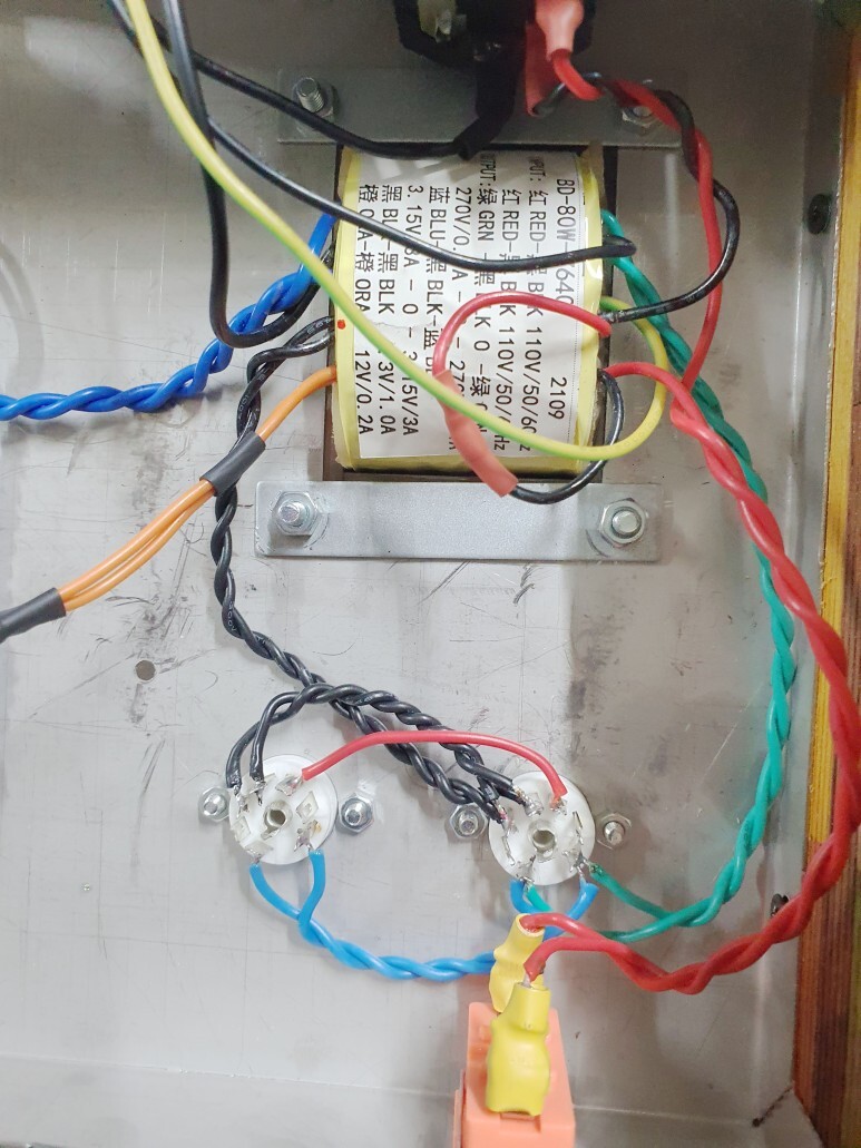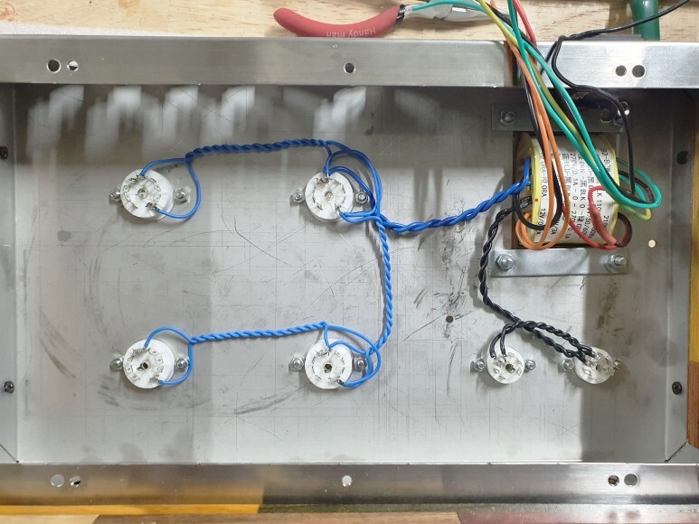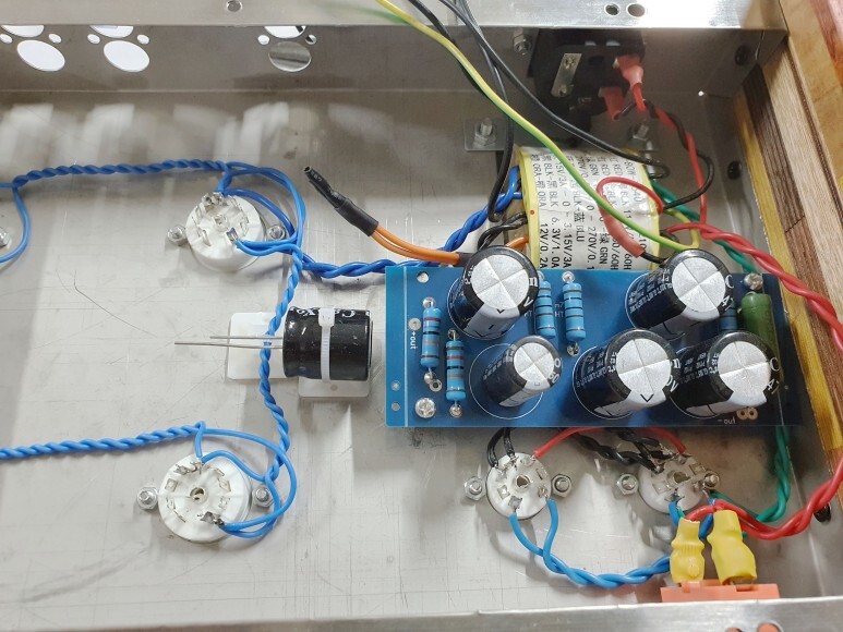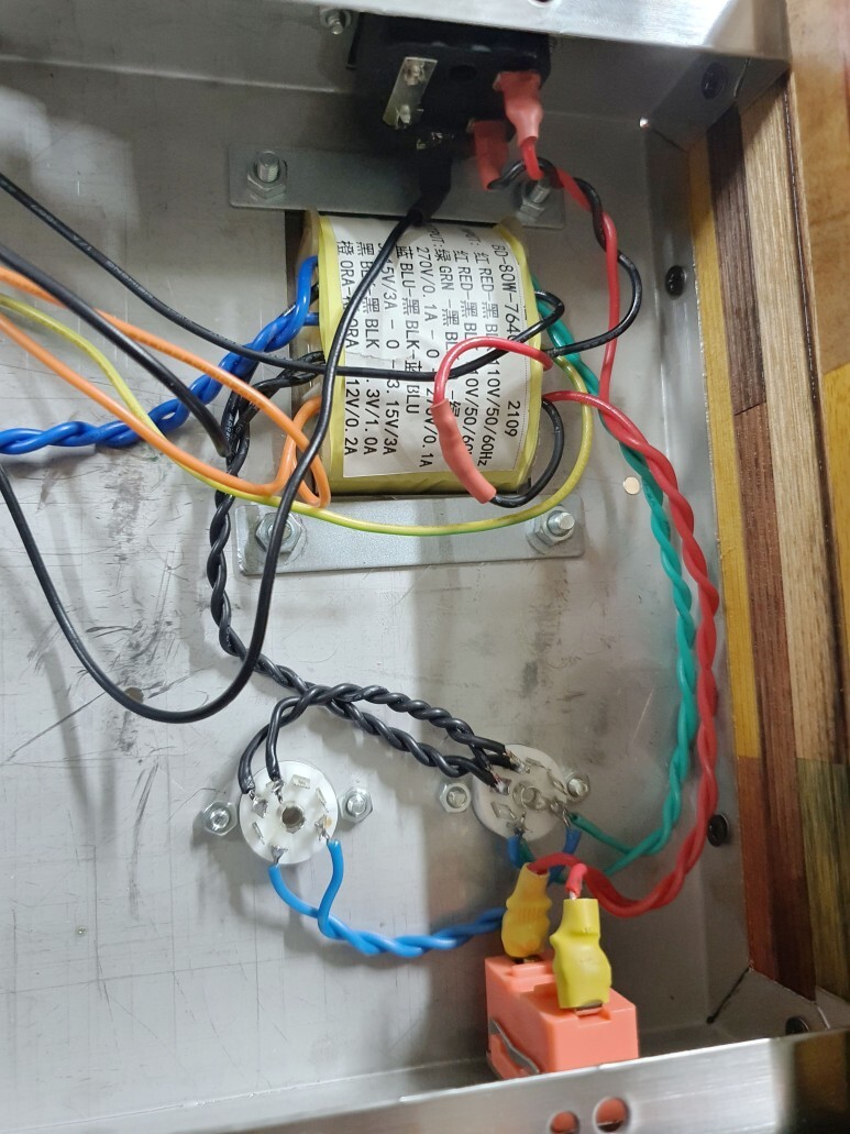 나중에 보니 전원스위치 배선이 진공관과 너무 가깝더군요. 스위치의 단자들은 조금 구부려서 가능한 진공관과 떨어지도록 했습니다.
