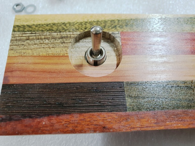셀렉터와 볼륨을 움직이지 않도록 걸림쇠가 있어서 이게 나무에 걸릴 것 같고 또 노브의 길이도 짧아서 구멍을 다 뚫었습니다. 또 전원스위치는 밖으로 드러나는 부분이 많아서 나무로 가려야했고, 셀렉터와 볼륨은 노브들로 가려질 거라서 구멍을 넓게 뚫어도 될 것 같더군요.