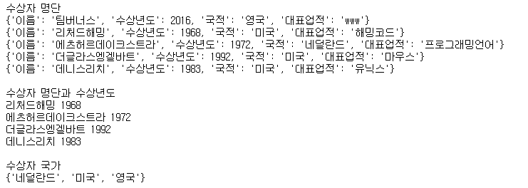 print(award['이름'], award['수상년도']) # 이름,수상년도 출력