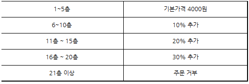학교 앞에 새로운 배달 식당이 문을 열었습니다. 이 식당은 음식값을 집의 층수에 따라 구분해서 받는다고 합니다. 다음 표를 기반으로 층수에 따른 가격을 산정해야 합니다. 주문자가 집호수를 입력하면 몇 층인지를 판단하여 가격을 출력하세요. 예를 들어 101호는 1층 1502호는 15층으로 계산합니다. 프로그램의 동작을 출력문으로 순서대로 설명하고, 그 설명에 따른 프로그램을 작성하세요.