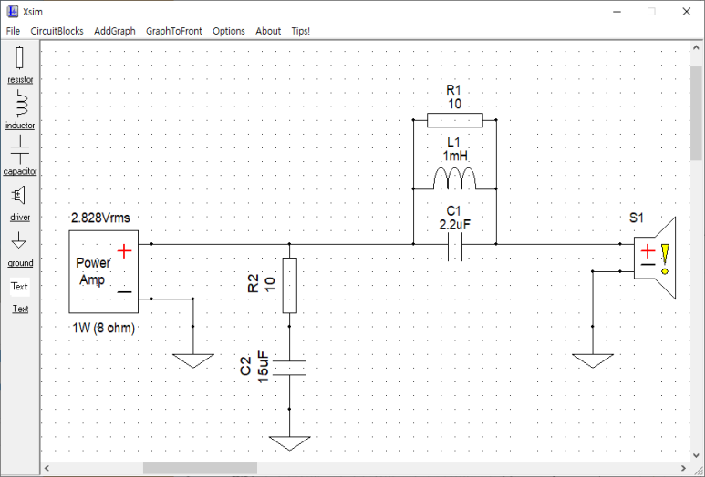 아래와 같은 회로입니다. 아래의 주파수 곡선은 삼미 8인치 (ME08B40)를 사용한 것이 아니고 임의로 다른 스피커의 수파수곡선을 사용해서 시뮬레이션 해봤습니다.