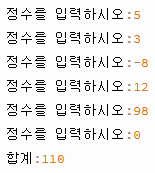 문제2 : 무한반복 while문을 사용하여 키보드로 입력된 정수의 합계를 계산하 고 만약 0이 입력되면 반복문을 벗어나 계산된 합계를 출력하시오.(000은 실제 계산된 결과가 출력되어야 함)