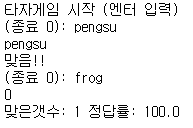 print('맞은갯수:',cnt,'정답률:',round(cnt/game_cnt*100,1)) # 맞은수와 정답률 출력