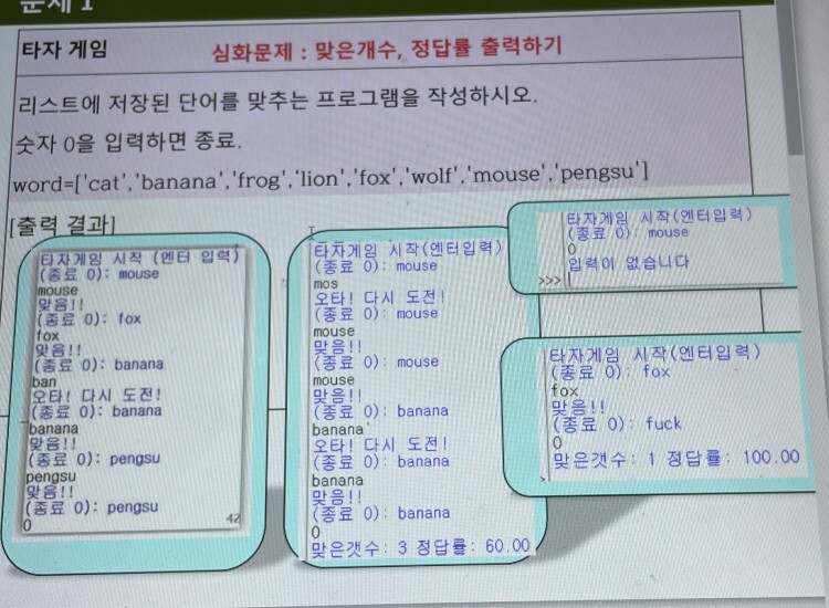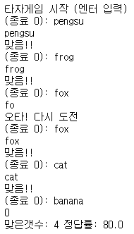 break # while 반복문 종료. 문제 단어의 오타를 다시 입력받기 위한 반복문 빠져나감
