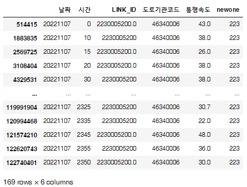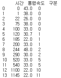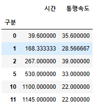 df["통행속도"] = [43.0, 38.0, 26.0, 38.0, 33.0, 30.7, 22.0, 33.0, 48.0, 30.0, 33.0, 33.0, 22.0, 22.0]