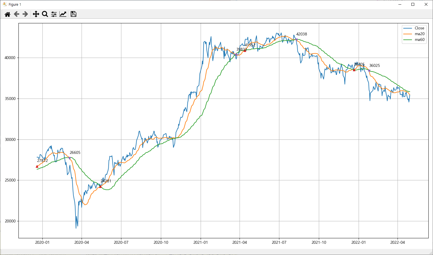 # 골든크로스(Golden cross) 및 데드크로스(Death cross) 확인(20일, 60일 이동편균선)