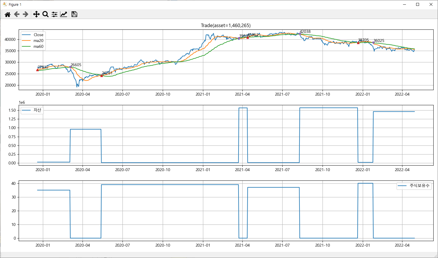 asset[i] = asset[i] - (stock_cnt[i] * df['Close'][i]) # 매수 후 자산=매수수략*종가