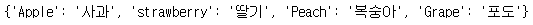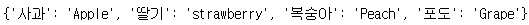 fruits_list = ['Apple = 사과','strawberry = 딸기','Peach = 복숭아','Grape = 포도']