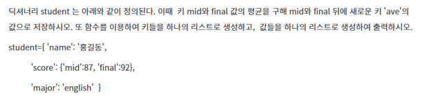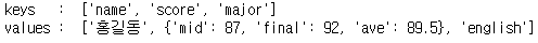 student = {'name':'홍길동', 'score':{'mid':87, 'final':92}, 'major':'english'}