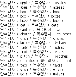 print(f"단수명사 : {word[i]} / 복수명사 : {plural[i]}")