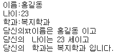 print("당신의\t이름은",name,"이고\n당신의\t나이는",age,"세이고\n당신의\t학과는",department,"입니다.")
