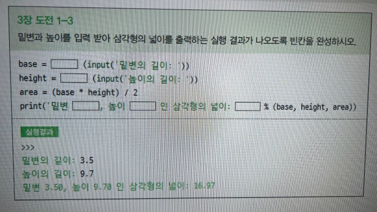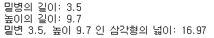 print('밑변 %0.1f, 높이 %0.1f 인 삼각형의 넓이: %0.2f'%(base, height, area))