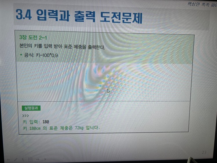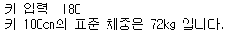 print('키 %0.0fcm의 표준 체중은 %0.0fkg 입니다.'%(h, (h-100)*0.9))