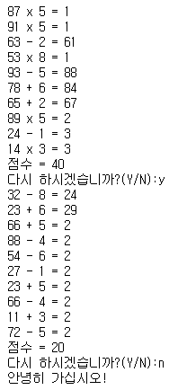while True: # 10번씩 문제를 하는 게임을 반복. 나중에 break로 짜져 나감