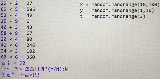 t = random.randrange(3) # +,-,x 를 위한 수 생성
