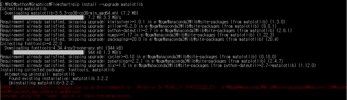 다음과 같이 matplotlib를 upgrade 해주니 설치가 되지 않고 코드도 동일한 에러가 발생합니다.