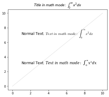 ax.set_title(r"$Title\ in\ math\ mode:\ \int_{0}^{\infty } x^2 dx$", math_fontfamily='stixsans', size=14)