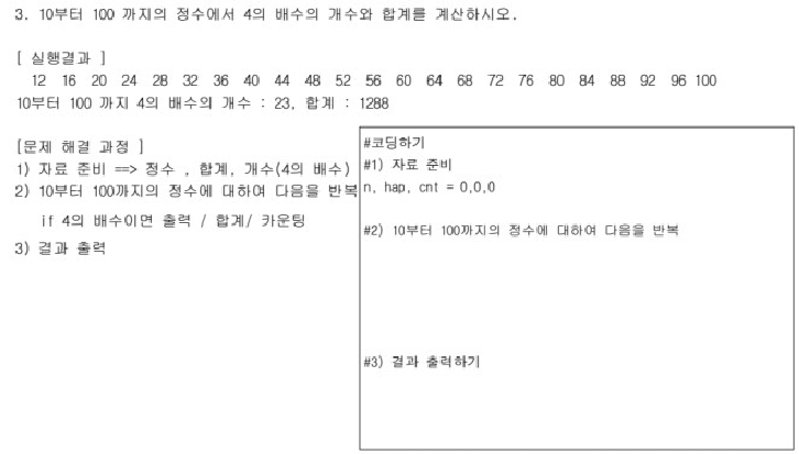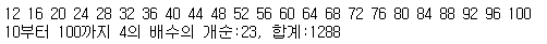 print("10부터 100까지 4의 배수의 개순:{cnt}, 합계:{hap}") # 출력