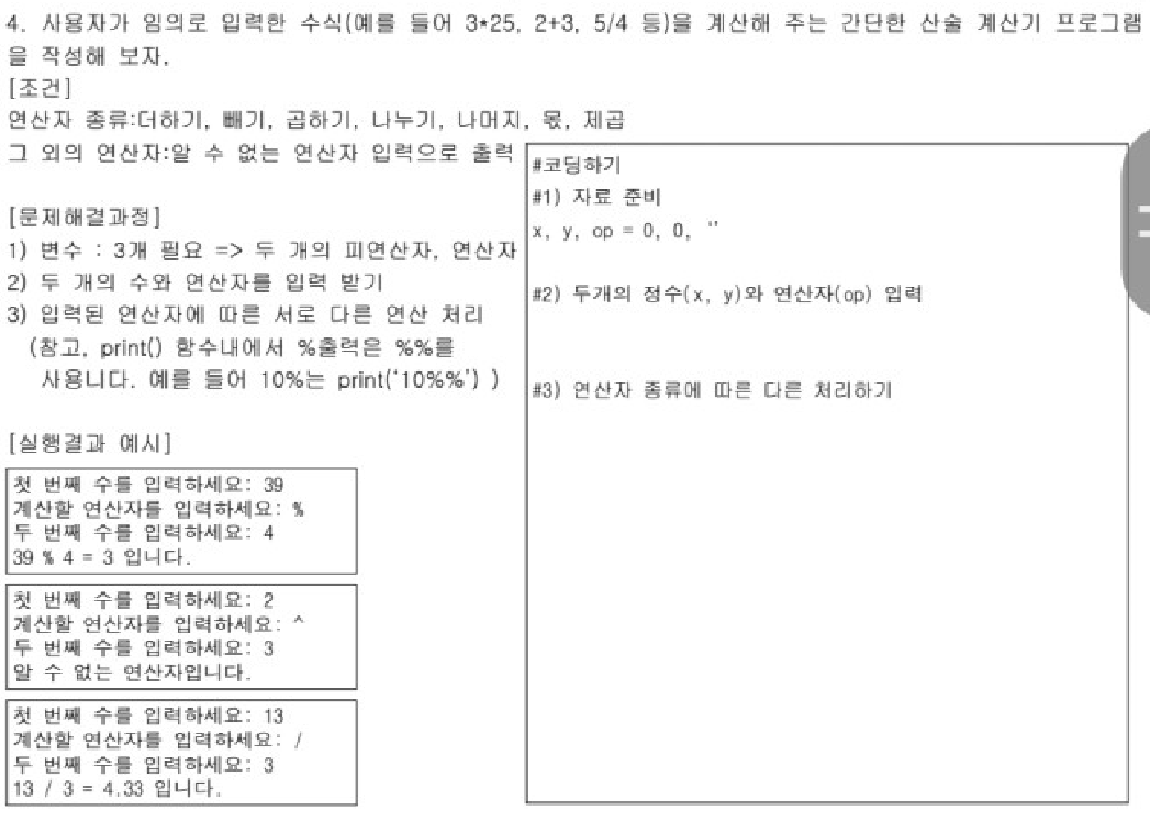 op = input('계산할 연산자를 입력하세요: ') # 연사자는 문자열 그래로 사용