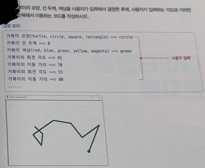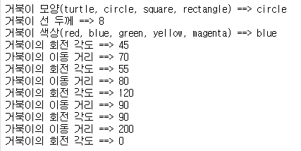 shape = ['turtle','circle','square','rectangle'] # 터틀 모양 리스트. 리스트로 지정해서 input시 사용
