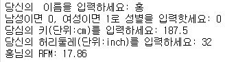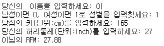 w = float(input('당신의 허리둘레(단위:inch)를 입력하세요: '))