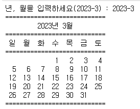 print(' {0:4d}년{1:2d}월'.format(year, month)) # 년, 월 출력