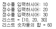 print('리스트 숫자들의 합 =',sum(lst)) # sum() 함수로 리스트의 전체 요소의 합계를 구할 수 있다.