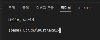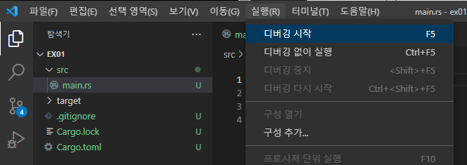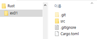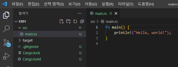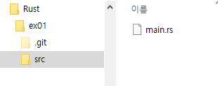 프로젝트에서 src 폴더 내에 main.rs 파일이 있고, Hello, world 코드가 자동으로 만들어져 있습니다.