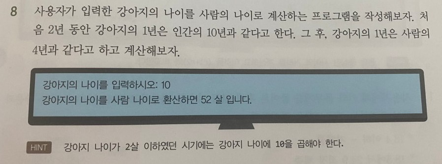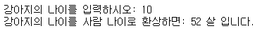 print('강아지의 나이를 사람 나이로 환상하면:',p_age,'살 입니다.') # 사람나이 출력