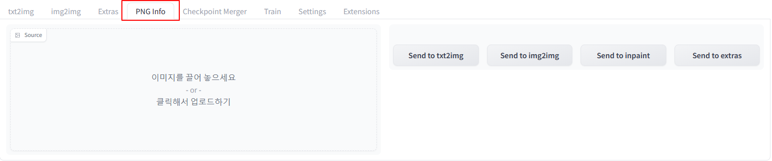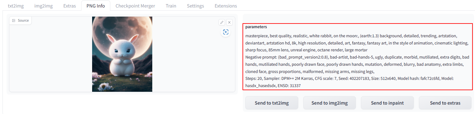 그럼 아래와 같이 오른쪽에 프롬프트가 보입니다. 'Send to txt2img' 버튼을 클릭하면 바로 txt2img 탭의 입력창에 항목들이 들어가게 됩니다.