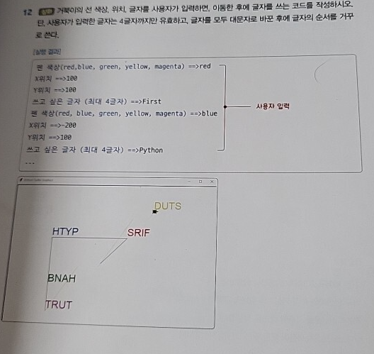 def drawText(text, x, y, c): # 이동 및 글자 쓰기 함수. text:쓰려는 글자, x,y:좌표, c:색