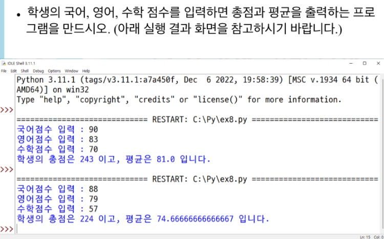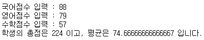 print(f"학생의 총점은 {c1+c2+c3} 이고, 평균은 {(c1+c2+c3)/3} 입니다.")