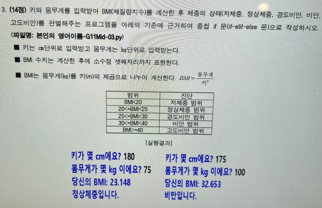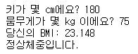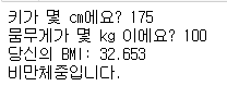 BMI = (weight / height**2) * 10000 # BMI 계산