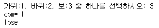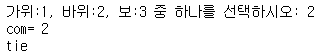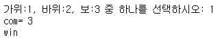 user_num=int(input('가위:1, 바위:2, 보:3 중 하나를 선택하시오: '))
