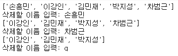 (1) input()문으로 삭제할 아이템 이름을 받는다. (2) while 반복문을 이용하여 해결한다. 예) sportsPeople = ['손흥민', '이강인', '김민재', '박지성', '차범근']