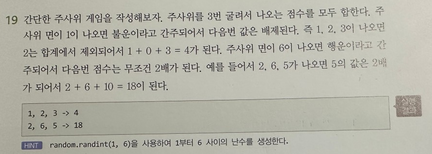 n1 = random.randint(1, 6) # 난수로 1~6 생성, n1, n2, n3 3개의 난수