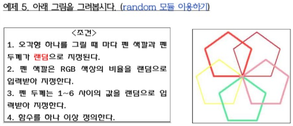 | [파이썬] 문제 : 터틀(turtle) 육각형 회전하며 그리기(색 random) (0) | 2023.05.18 |