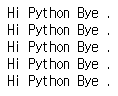 print_n_times2(5, "Hi", "Python", "Bye", ".")