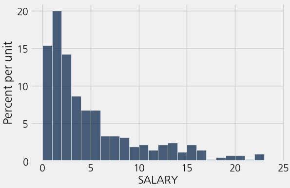 nba.hist('SALARY', bins=np.arange(0,25,1))